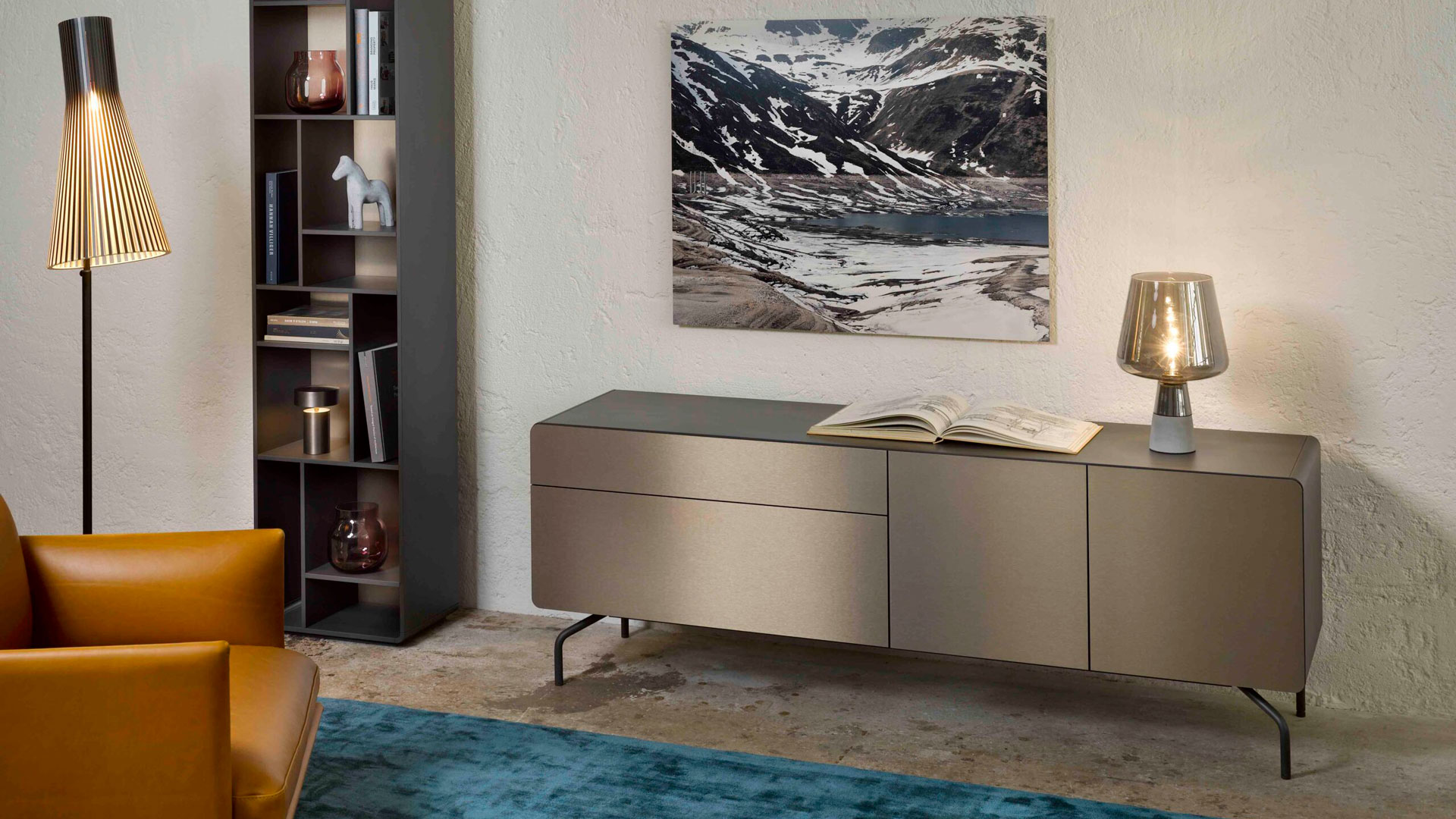 Sideboards, Regale und Wohnwände können nach Mass zusammengestellt werden und auch die Materialisierung lässt keine Wünsche offen. Lack, Massivholz, Furnier, Glas oder Keramik können nach Belieben kombiniert werden.